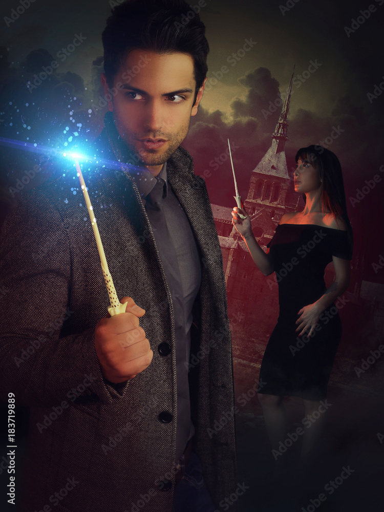 Book Cover For A Fantasy Novel With Two Wizards Holding A Magic Wand Stock Photo Adobe Stock